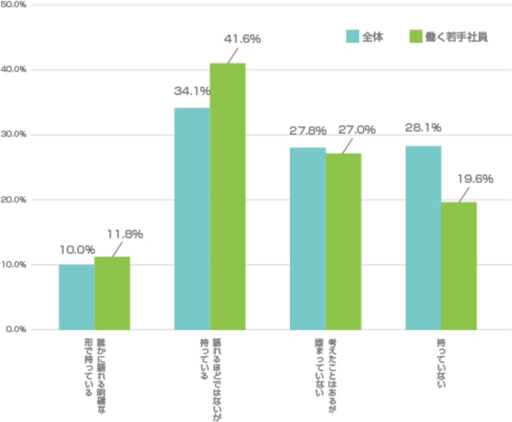 働く若手社員においては、「語れるほどではないが持っている」(41.6%)と「考えたことはあるが固まっていない」(27%)が高く、「持っていない」回答者の比率は全体と比較すると約10%少なくなりました。