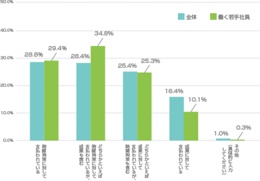 金銭報酬が何に対して支払われていると考えるか問うたところ、全体では回答者の半数以上が「時間拘束に対して支払われている」「どちらかといえば時間拘束に対して支払われている」と答えました。