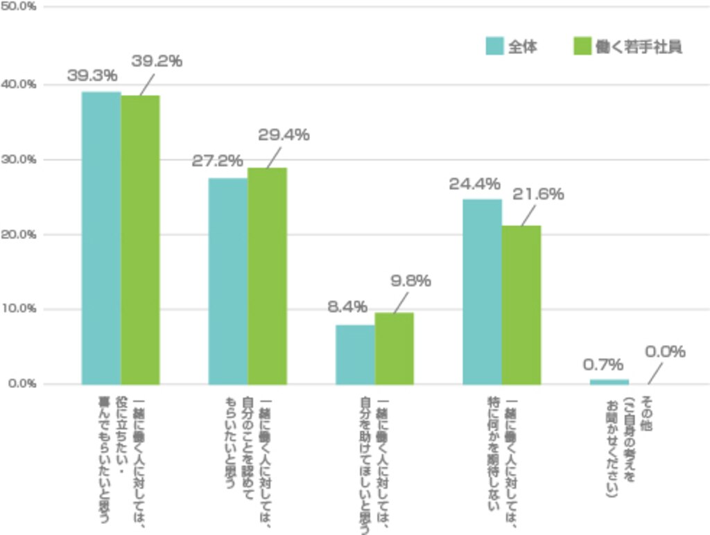 一緒に働く人に対してどのような考えを持っているか問うたところ、「役に立ちたい・喜んでもらいたい」という回答が全体・働く若手社員双方で最も多く約40%となりました。2位の「自分のことを認めてもらいたい」と合わせると70%近くを占める結果となっています。