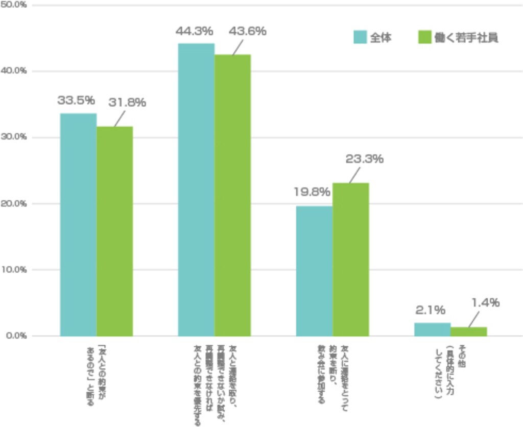職場での飲み会とプライベートの予定の優先順位について、仮定の状況をもとに問うたところ、回答者全体・働く若手社員を通じて、「調整を試みた上で、友人との約束を優先する」が最も多く回答された。次いで、「飲み会を断る」が二位となりました。