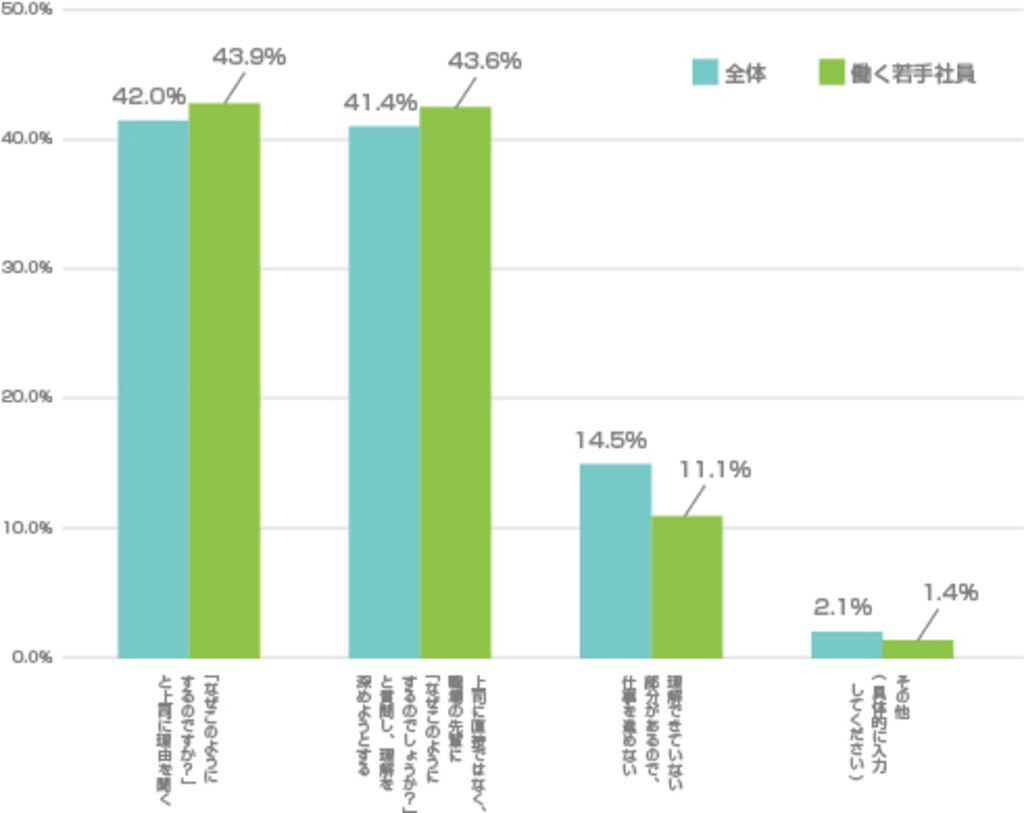 なぜそのような指示をされるのか理解できないときに、どのような行動をとるか。業務指示をどのように受け止めるか、仮定の状況をもとに問うたところ、回答者全体・働く若手社員を通じて、「上司に理由を聞く」が一位、ほぼ同率で「先輩に質問する」が二位となりました。