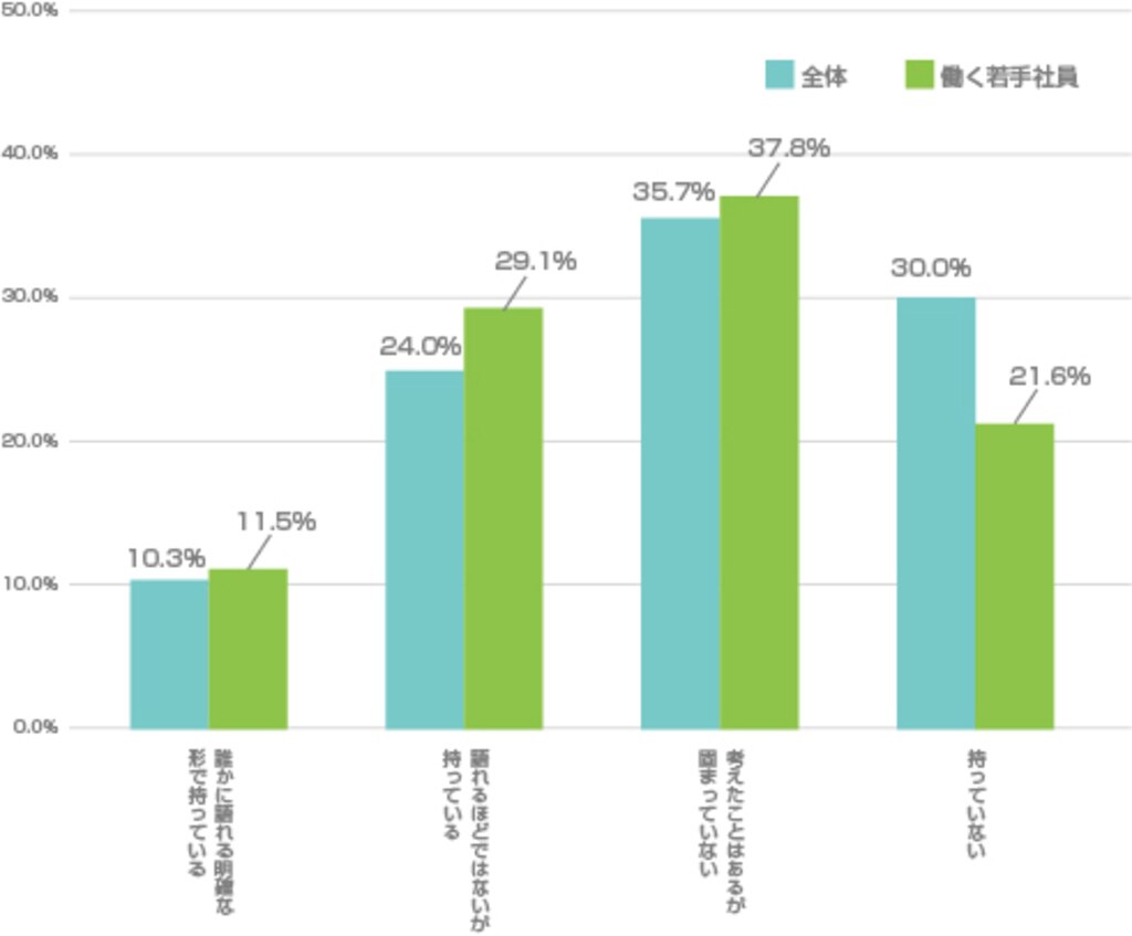 回答者全体・働く若手社員どちらにおいても、「語れるほどではないが持っている」が最も多く、「誰かに語れる明確な形で持っている」は最も少ないという結果に。