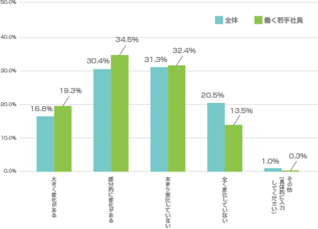 コロナウィルスの感染拡大による、回答者自身の仕事観・キャリア観の変化を問うたところ、「部分的に変化がある」が一位となりました。また、回答者全体と働く若手社員を比較したとき、「全く変化していない」と回答した若手社員の傾向値は低くなっています。