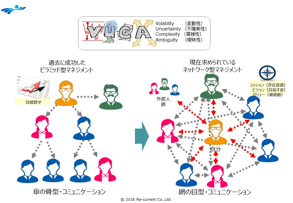 リ・カレントでは成果をあげる理想の組織像は「クローズピラミッド型」ではなく「オープンネットワーク型」であると考え、