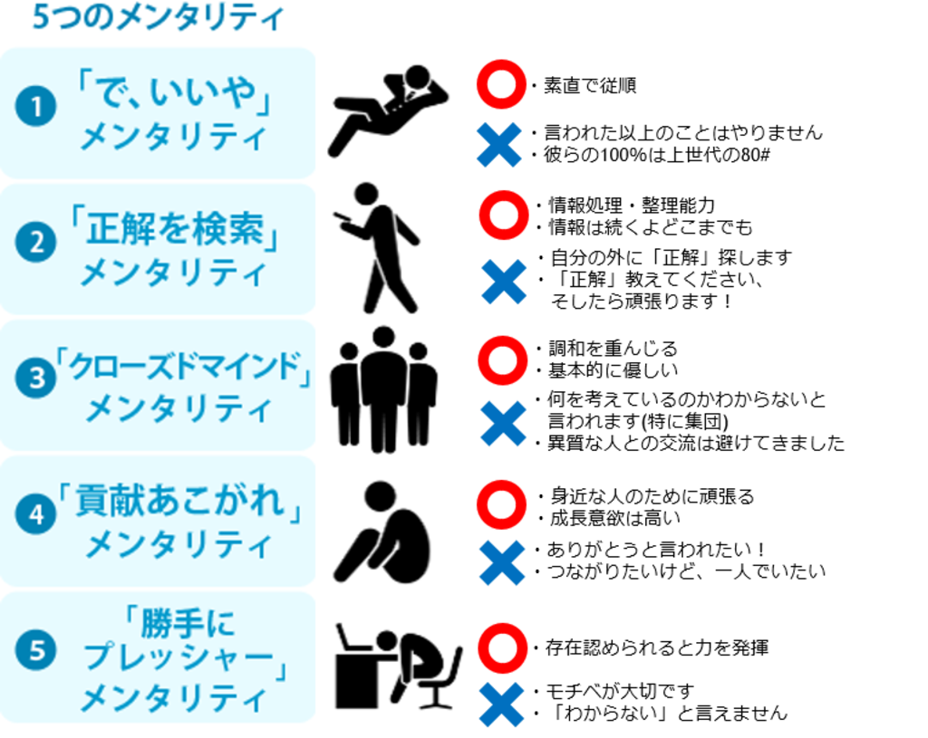 リ・カレントでは、こうしたいまどき新入社員の特徴を次の5つのメンタリティに表しています。