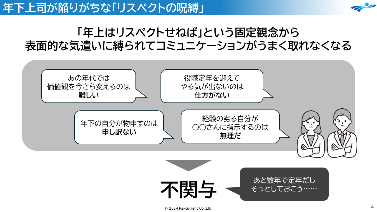 「年上の方には●●のように接しなくてはならない」というマネジメント側の、「リスペクトゆえ」の固定概念が、年下上司と年上部下、双方を苦しめてしまっている構造が見えてくるのです。