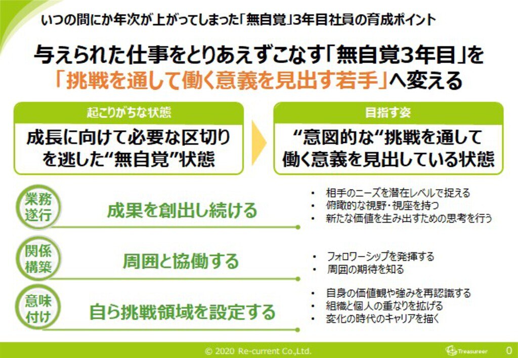 そんな「無自覚3年目」が、自ら働く意義を見出す若手に変化するために、リ・カレントは次の3つの力を身に着けることを提案します。