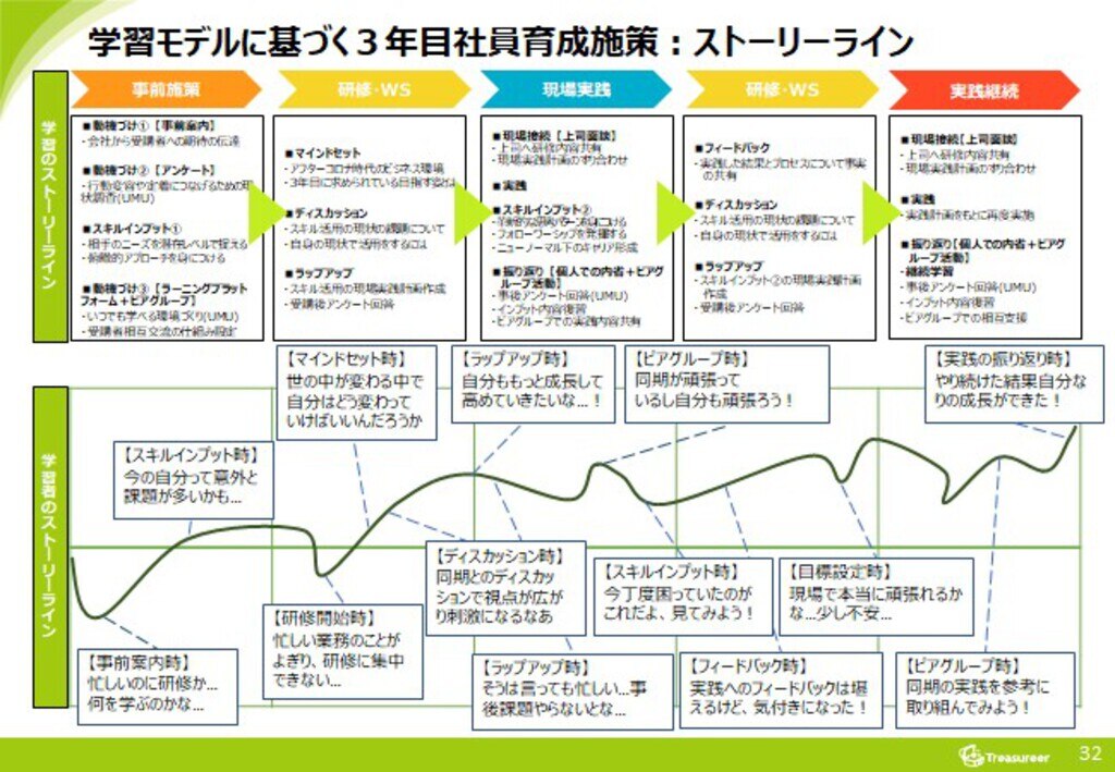 下図の「学習者のストーリーライン」(下段の起伏のあるグラフ)をご覧ください。学習者起点の学びを設計するためには、「点」の施策ではなく学習者の感情や意欲の推移を捉え「線」の学習(=ストーリーライン)を設計することが重要です。このストーリーラインに基づき具体的な育成施策を検討します。