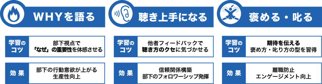 管理職向けのコミュニケーション術の中でも、研修でこそ学ばせるべき内容は「WHYを語る」「聴き上手になる」「褒める、叱る」です。
