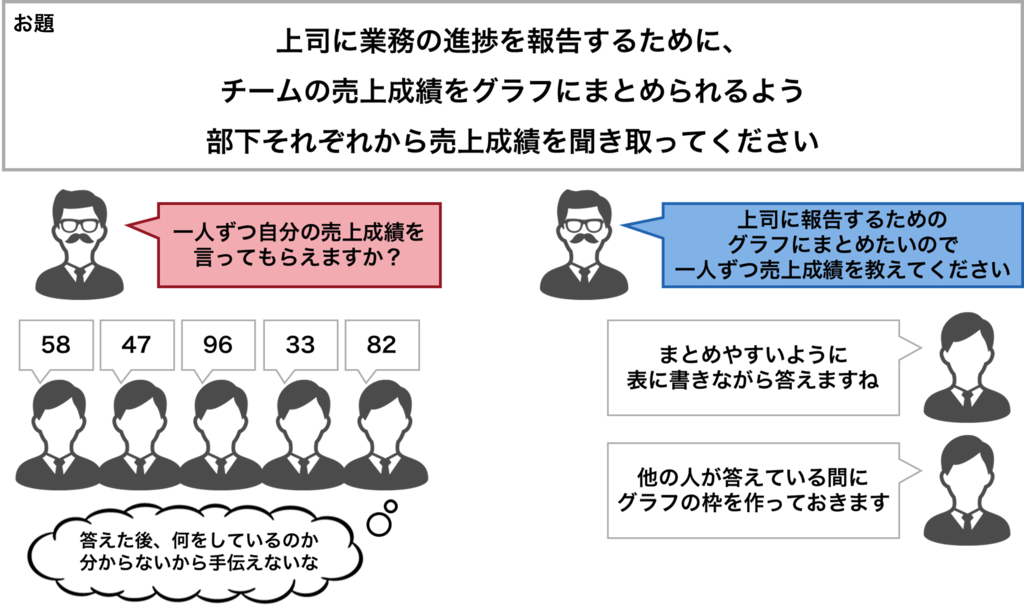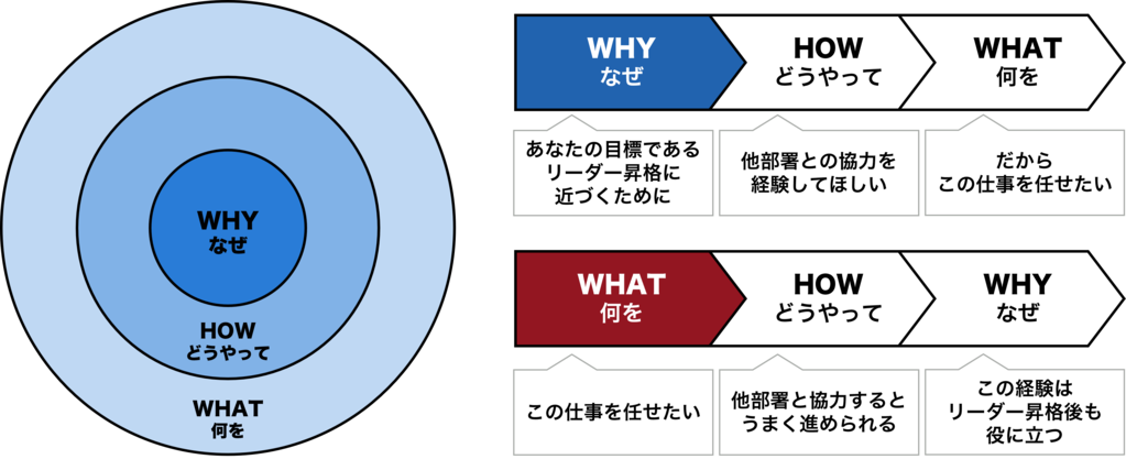 すなわち、WHAT=何の仕事を進めてもらいたいかは指示するが、WHY=目的の説明は割愛してしまう。場合によっては、HOW=手段の説明すら省いてしまうという方もしばしば見られます。
