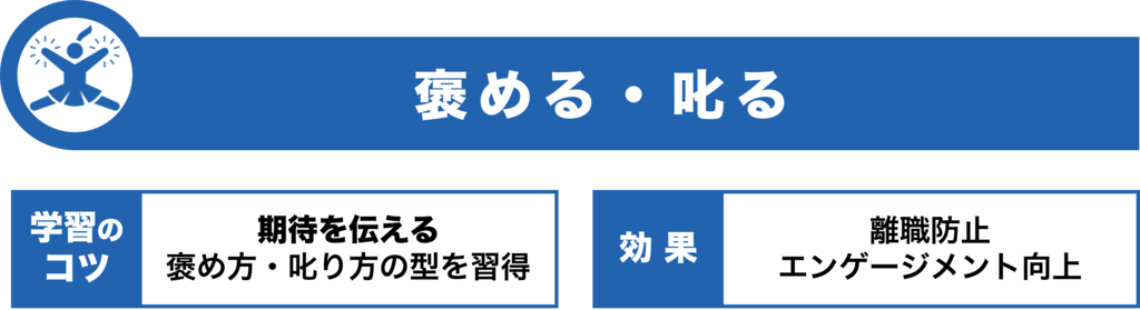 - ■「褒める・叱る」:期待を伝える褒め方・叱り方の「型」を習得させる