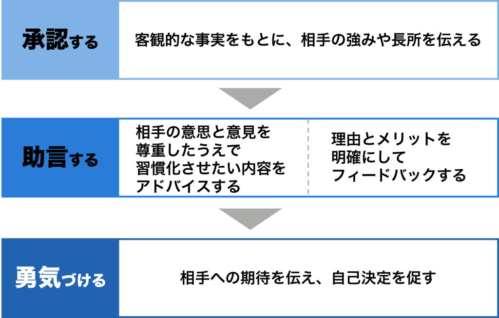 部下を勇気づける褒め方・叱り方には、「承認→助言→勇気づけ」という型があります。
