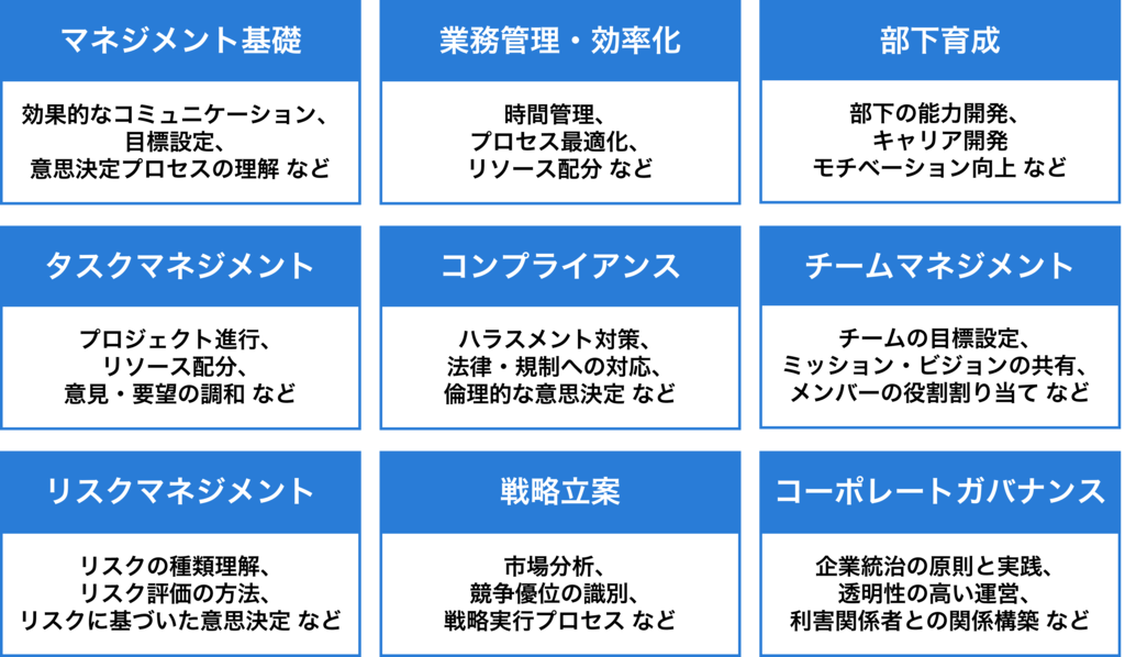 これらのスキルは、管理職が日々直面する多様な課題を効率的に解決し、チーム全体を成功に導くための基盤となります。