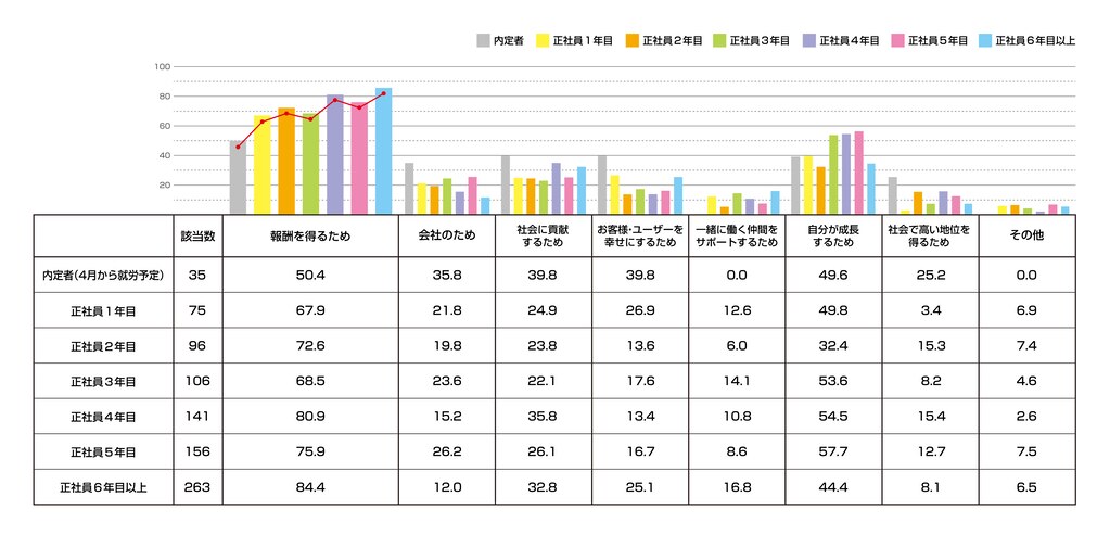 年次ごとの回答結果を見たところ、まず「仕事観(働く目的・譲れないもの・価値観)」については、「報酬を得るため」とする回答割合が年次が上がるにつれ増加していることがわかった。