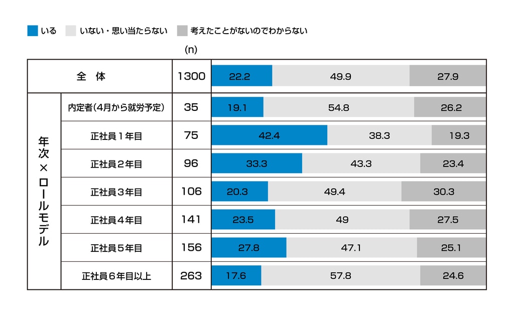 さらに、同様の集計軸にて「ロールモデル」の有無を見ると、こちらも正社員3年目で大きく低下し、正社員1年目と比較して半分以下となっていることがわかった。