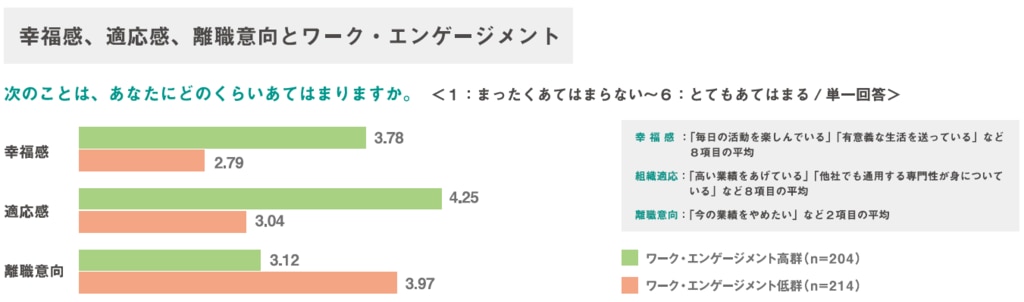 ワークエンゲージメントの高さは、個人と組織の両者によい影響を与えることが明らかになっており、特に「個人の幸福感」「組織や仕事への適応感」「離職意向」について、ワークエンゲージメントの高さ・低さが大きく影響するのです。