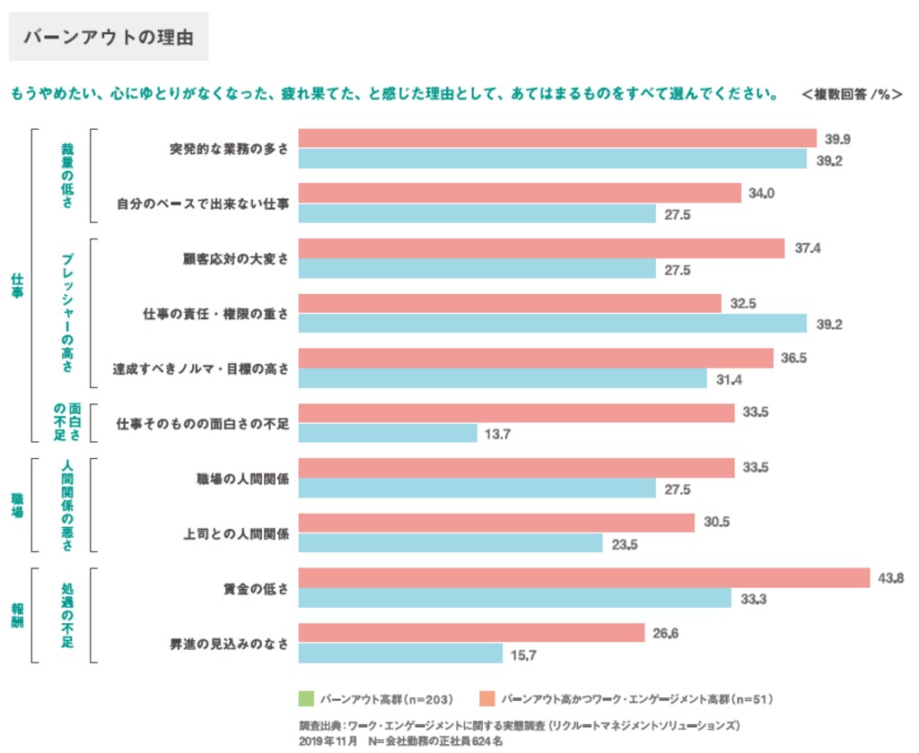 そして同様に、労働意欲をなくし心身のエネルギーを失ってしまう状態(バーンアウト=燃え尽き症候群)を引き起こす理由としても、ワークエンゲージメントの低下があげられます。