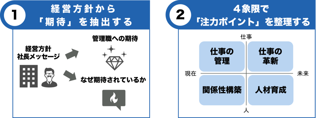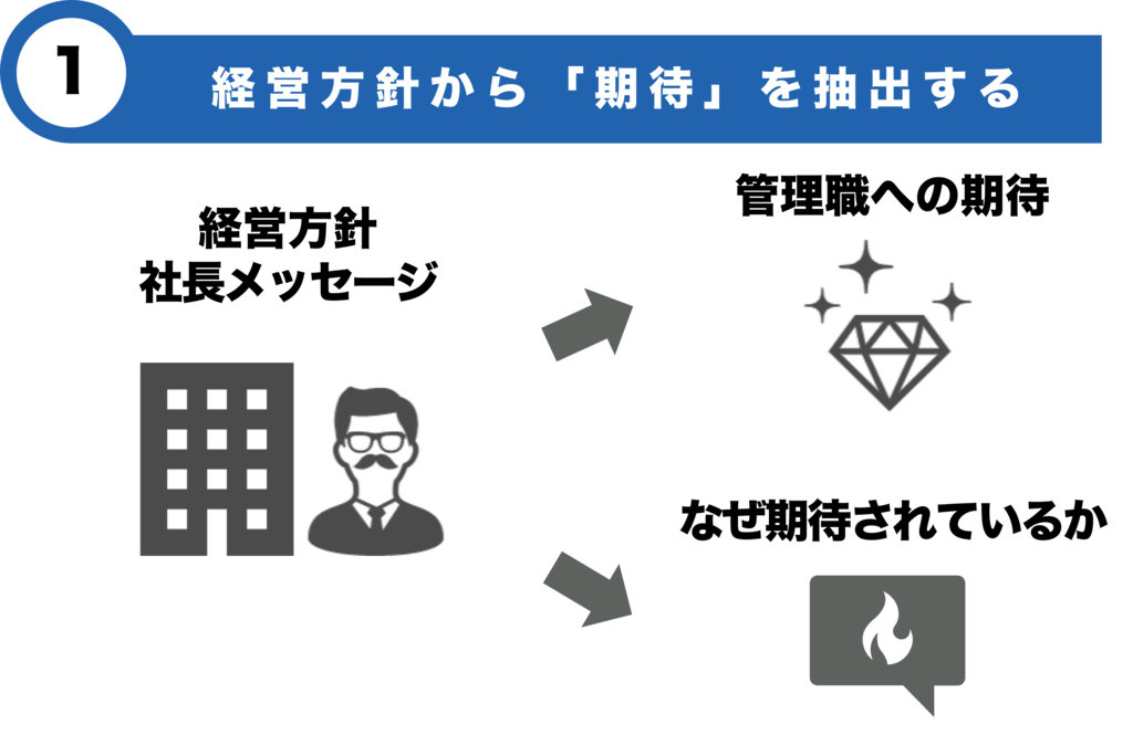 1ステップ目は、経営方針から「管理職への期待」を抽出する。