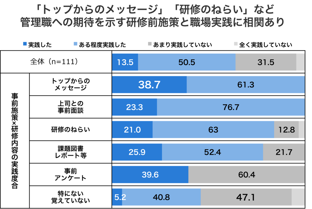 研修受講前に「社長からのメッセージ」や「研修のねらい」を伝えられた受講者のうち、職場に戻ってから研修内容を実践した人数は、なんと平均の約3倍となっています。