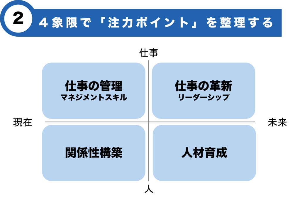② 「管理職に求めるもの」を「仕事/人」×「未来/現在」の4象限で整理する