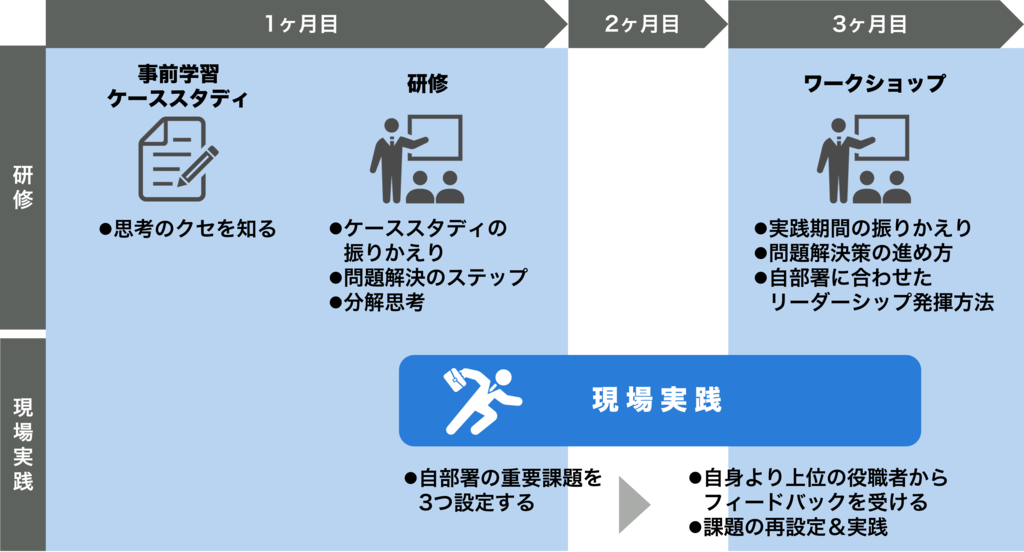 リーダーシップが注力ポイントであることから、あえて研修を二度に分け、自部署で実際にリーダーとして問題発見・課題解決を行う実践期間が設けられているのが特徴です。