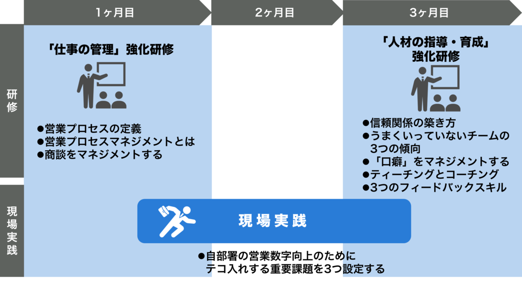 そのため、メンバー層の個々人に向けて営業力強化研修が実施されると同時に、管理職層には日常業務を通してのトレーニングが期待されていました。