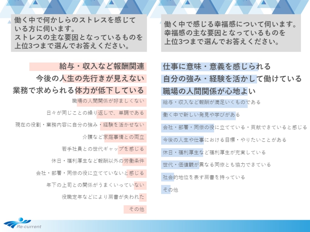 働く50代・60代を対象に、働く中で感じるストレス・幸福感の度合いと、その主な要因を聞きました。