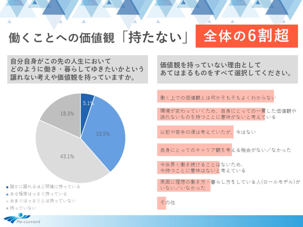 その上で、そうした価値観を持たない理由を調べると、トップは「働く上での価値観とは何かそもそもよくわからない」(27.2%)となり、「今後長く働き続けることはないため、今持つことに意味はない」(25.1%)「若手の頃はあったが今はない」(17.8%)が続きました。