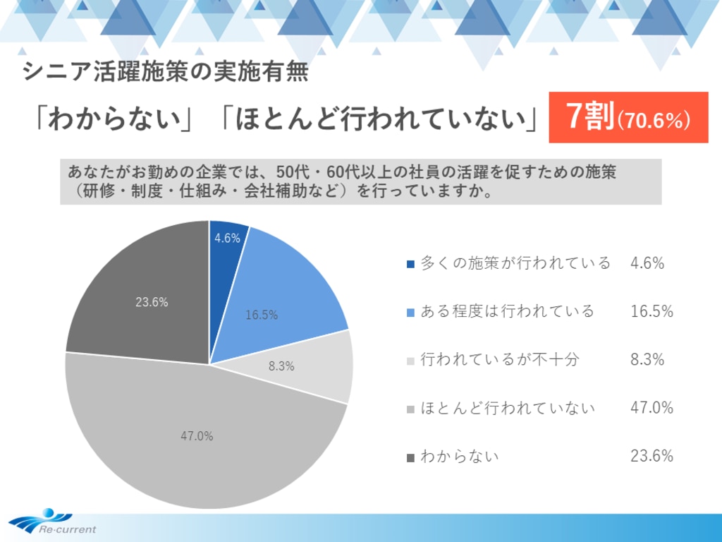 - シニア活躍施策の実施有無、「わからない」「ほとんど行われていない」が合わせて7割(70.6%)、「行われているが不十分」を合わせると8割近くに
