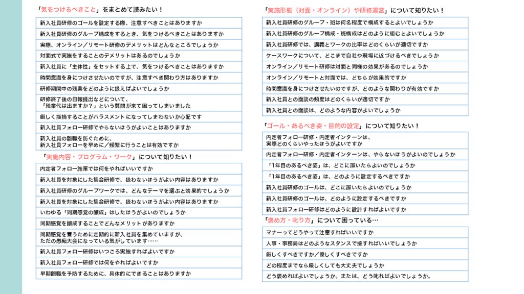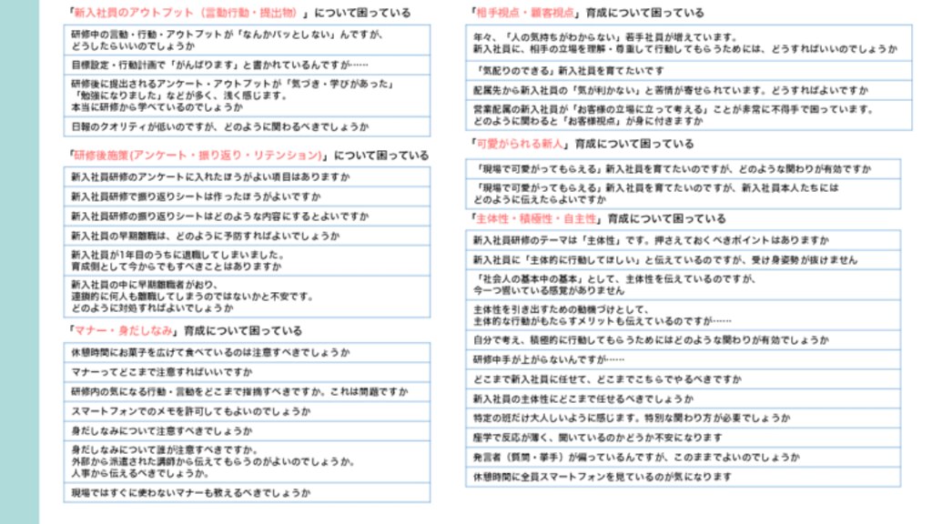 新人研修に携わる中で、「検索しても出てこないけど、これってどうすれば……?」「ちょっとした話だけど、研修会社に質問するのも気が引ける」とモヤモヤしたことはありませんか?