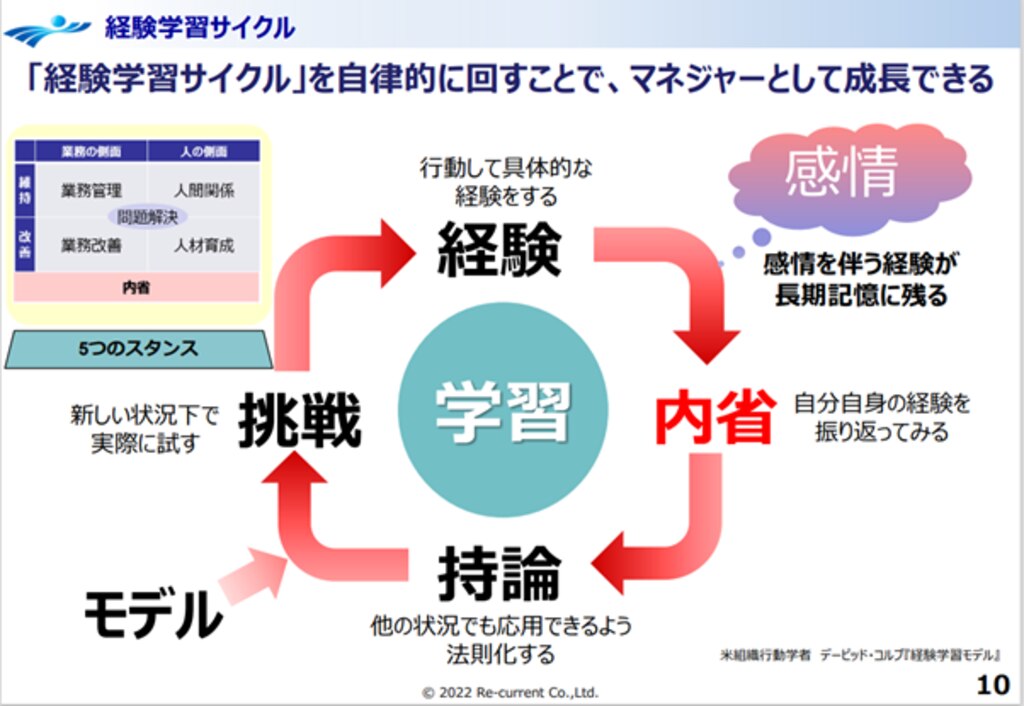 経験学習サイクルのメッセージの中核は、「部下にいかに経験学習で学んでもらうか」という側面が強くなっています。しかし、部下に経験学習で持論を引き出せるコミュニケーションを取れる管理職は、自らもマネジメント経験における学習サイクルを回しています。