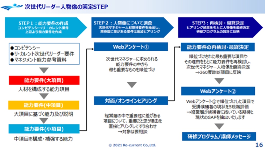 どんな人物を次世代マネジャー候補として選抜するべきか、その要件定義や合意形成は重要な課題です。リ・カレントでは、次世代マネジャーとなる人物の要件を3ステップで策定しています。
