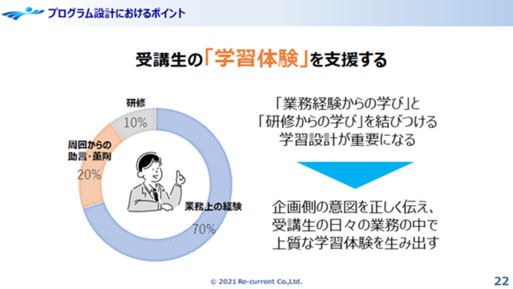 業務経験からの学びと研修からの学びを結びつける設計をすることで、受講生が日々の業務の中で学習できるようになるようなプログラム設計がポイントとなります。
