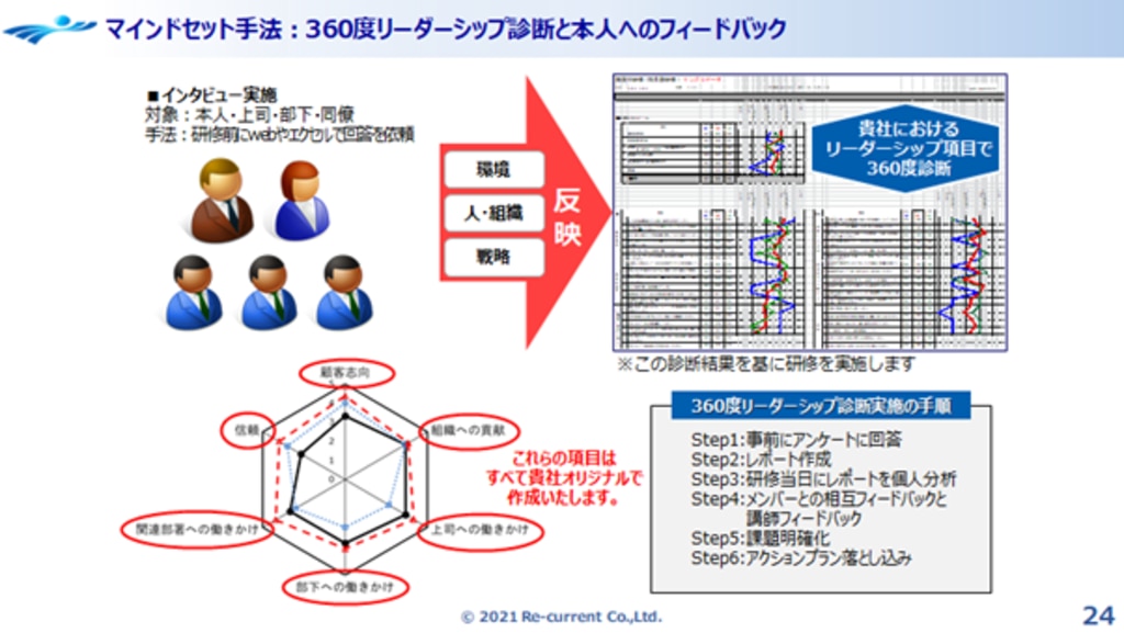 ①マインドセットの方法として、360度診断とそのフィードバックを行います。
