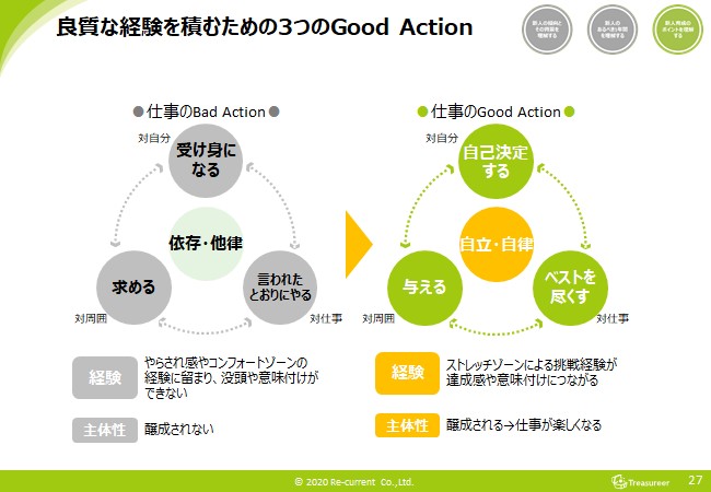 ストレッチゾーンに挑戦し、それによってポジティブな結果をもたらすのに必要なマインドセットを身に着けるための、3つの行動・言動(3つのGood Action)と、それらの行動を引き起こすための育成のポイントをお伝えします。