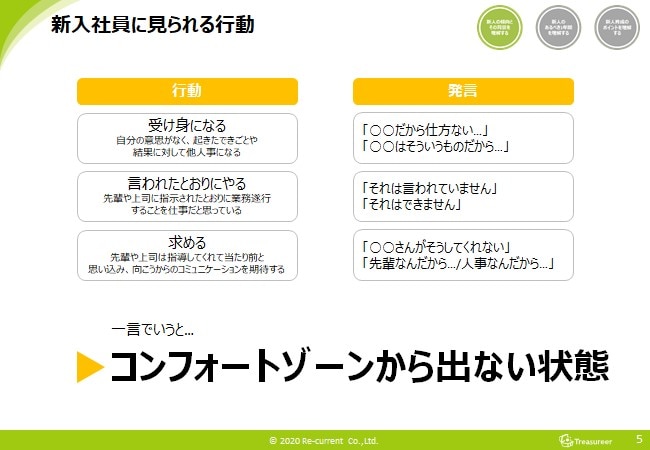 新入社員によく見られる傾向として、新入社員が受け身で居心地のいい空間である「コンフォートゾーン」から脱することなく、「コンフォートゾーン」にとどまりがちな傾向があります。