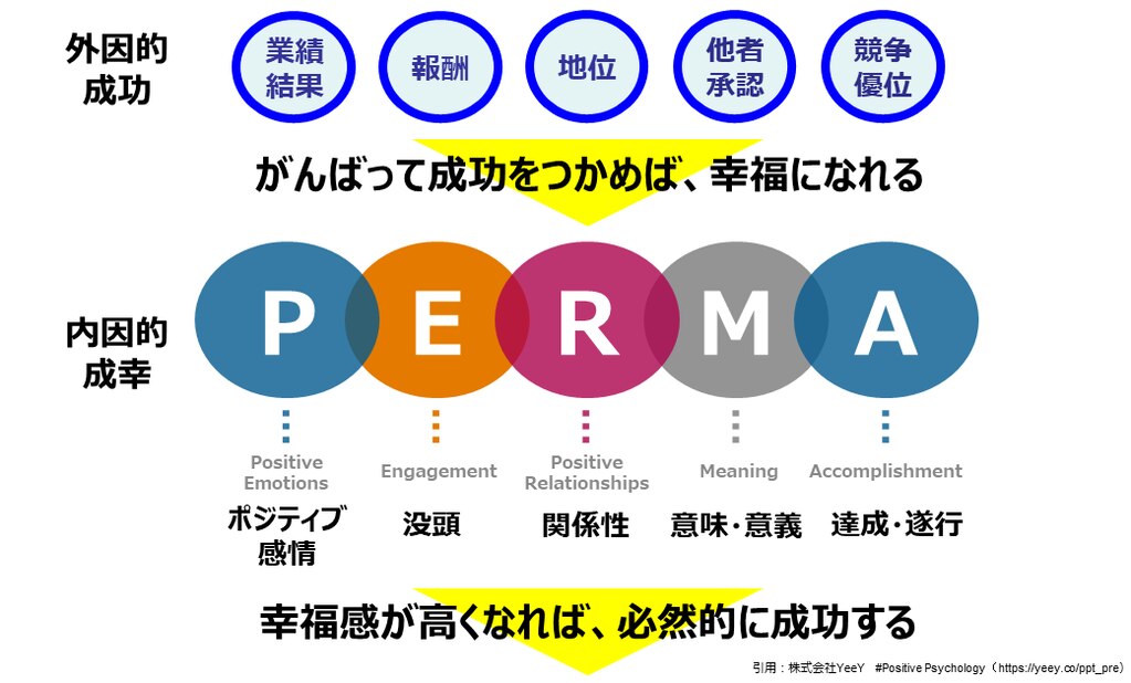 一方、近年の欧米では、内因的要素=PERMAを満たせば幸福感が持続するという考え方が主流になりつつあります。PERMAは幸せを構成する要素の頭文字を取ったもので、ポジティブ心理学の第一人者であるマーティン・セリグマン博士によって提唱されました。要素は次の5つです。