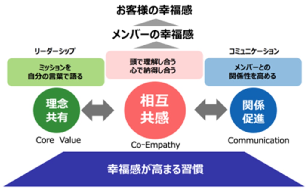 そして、幸福中心の組織を形成するためには、チーム全体で、幸福感が高まる習慣を身に付け、理念を共有し、メンバーとの関係性を高め、相互に共感する状態を目指していかなければなりません。