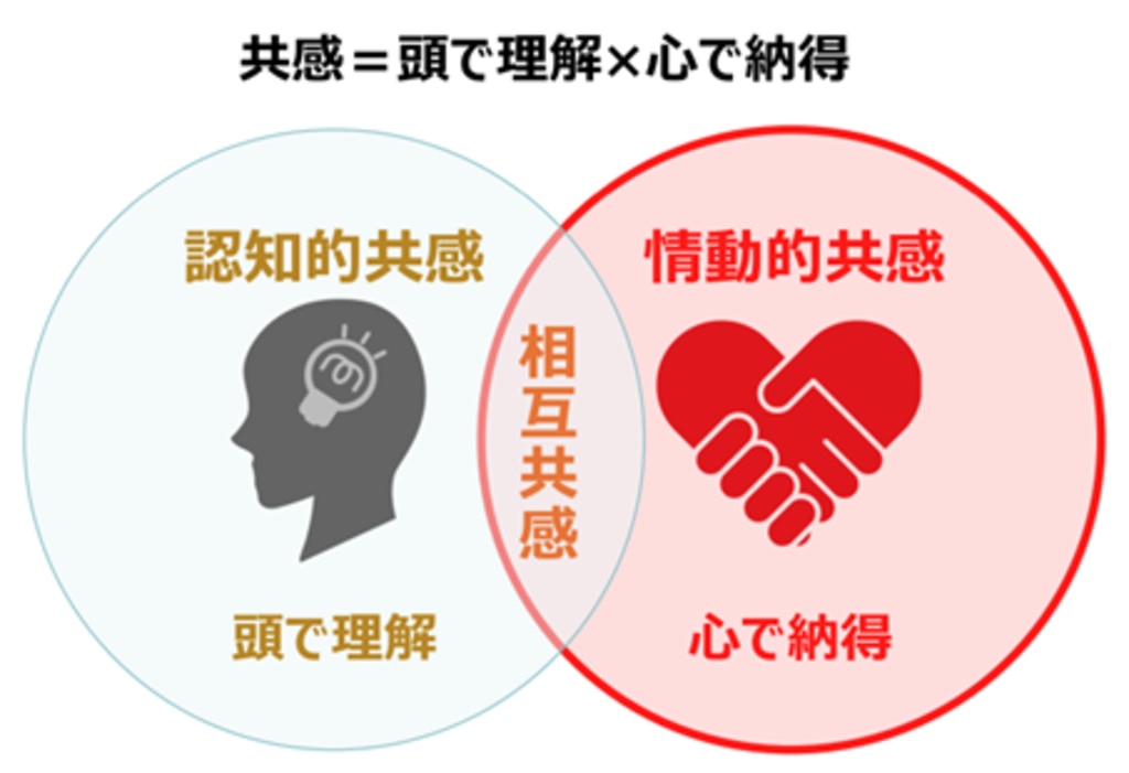 相互共感とは「頭で理解する認知的共感」と「心で納得する情動的共感」がどちらも満たされている状態のことです。片方だけでは、相互共感とはいえません。日頃においては、情動的共感ができない、または、得られないことが多いのではないでしょうか。
