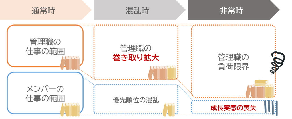 変化対応が求められ続ける中で、管理職は部下に任せていた業務も自身で担当することで混乱期を乗り切ろうとし、部下には「今できる範囲の仕事」ばかりを任せるようになっていきます。