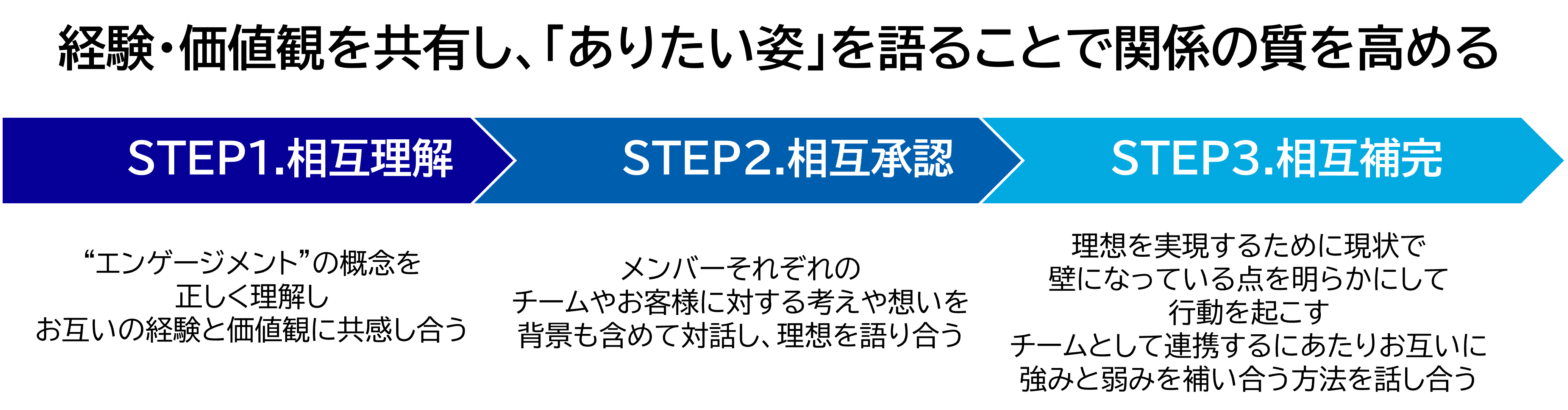 相互承認:それぞれのチームやお客様に対する考えや想いを対話し、理想を語り合う