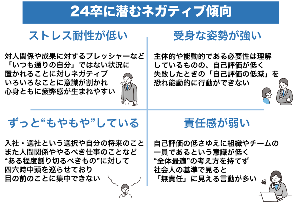 今回焦点を当てたのは、24卒内定者が持つ様々な特徴の中でも彼らの成長を促進するために人事担当者に知っておいていただきたいネガティブに働き得る側面です。