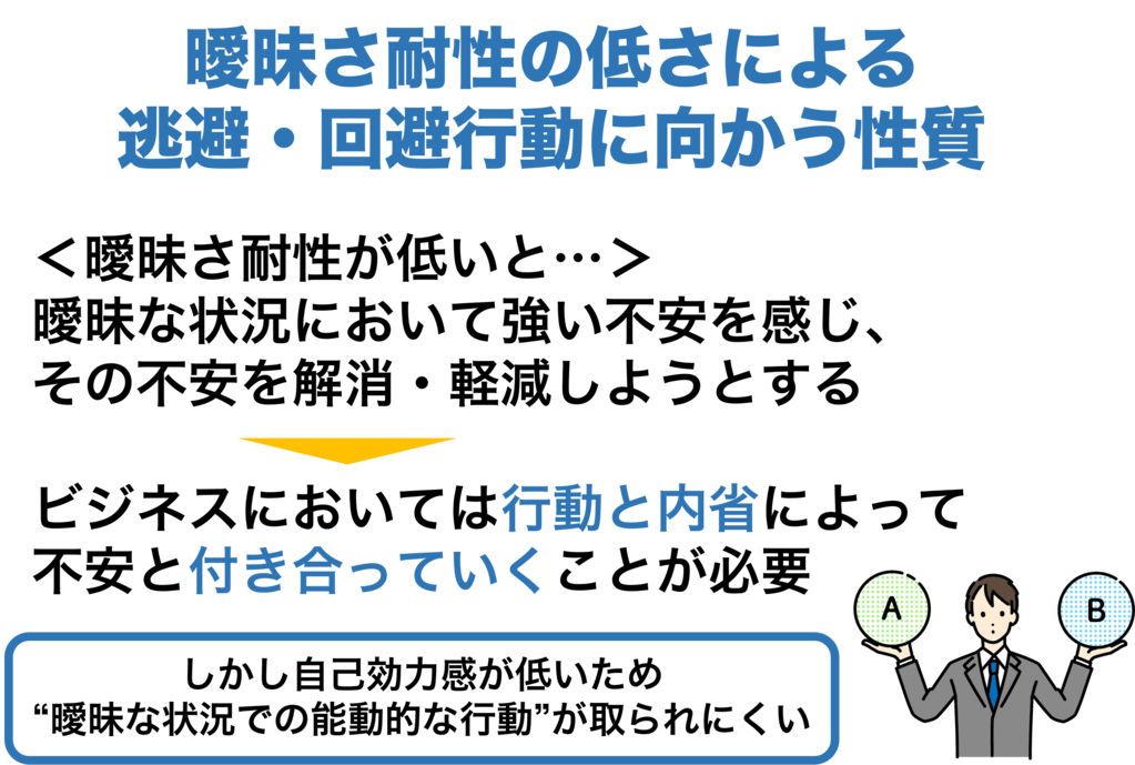 曖昧さ耐性が低いと、その不安を軽減しようと質問をし、方法を模索し、最悪の場合には、自分の将来や組織の合理性に疑念を抱くことがあります。
