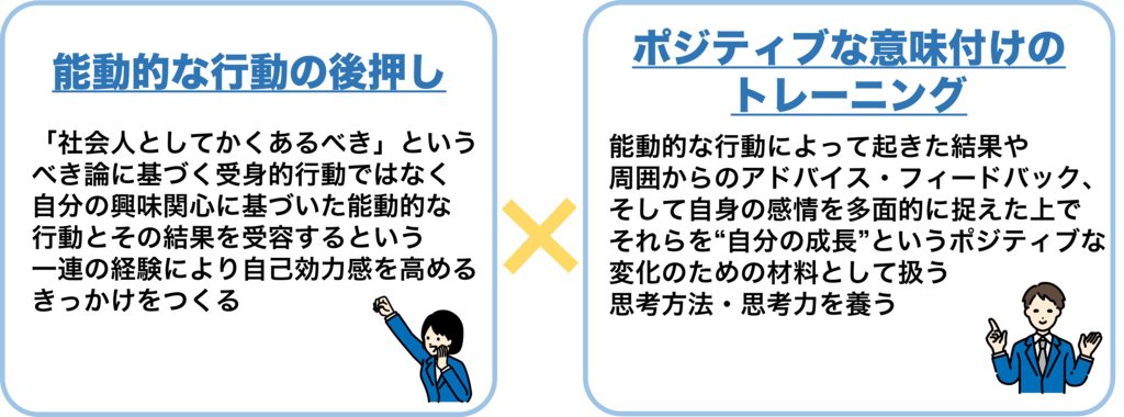 これは成功体験や代理体験が不足しているためであり、彼らが自分で課題を設定し、その結果を受け入れる経験が不足しているからです。