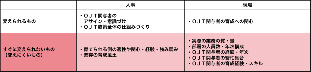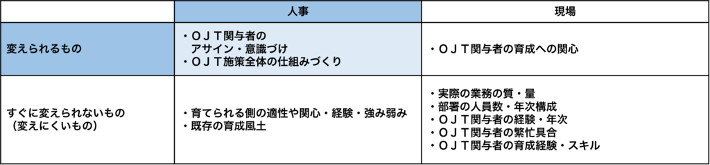 冒頭にも述べ、表に整理してきたように、OJT施策において人事側から「変えられるもの」は、ほぼ2つに絞られます。