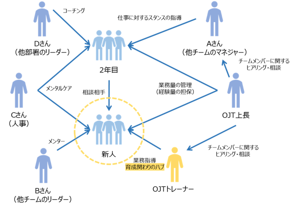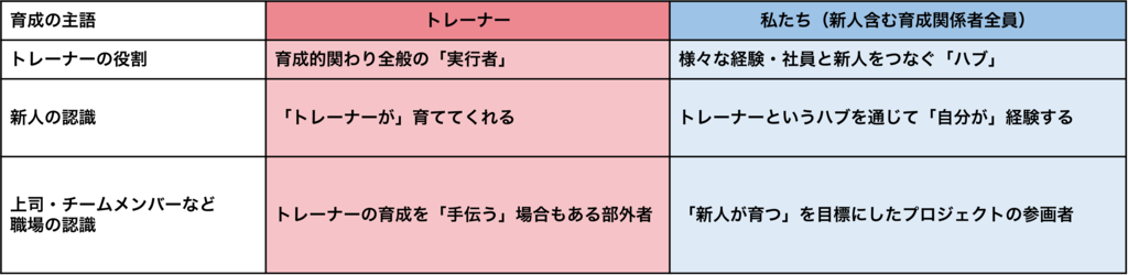 新人本人も、「トレーナーに育ててもらう」受益者ではなく、トレーナーというハブを通じて様々な経験につながり・育つ育成の主体者です。