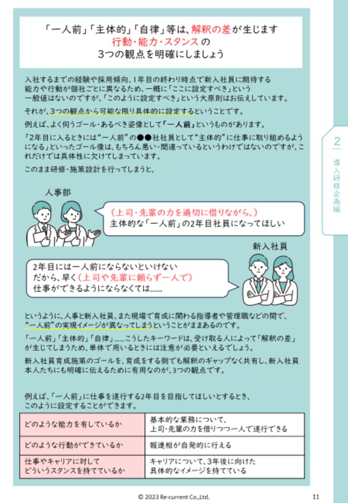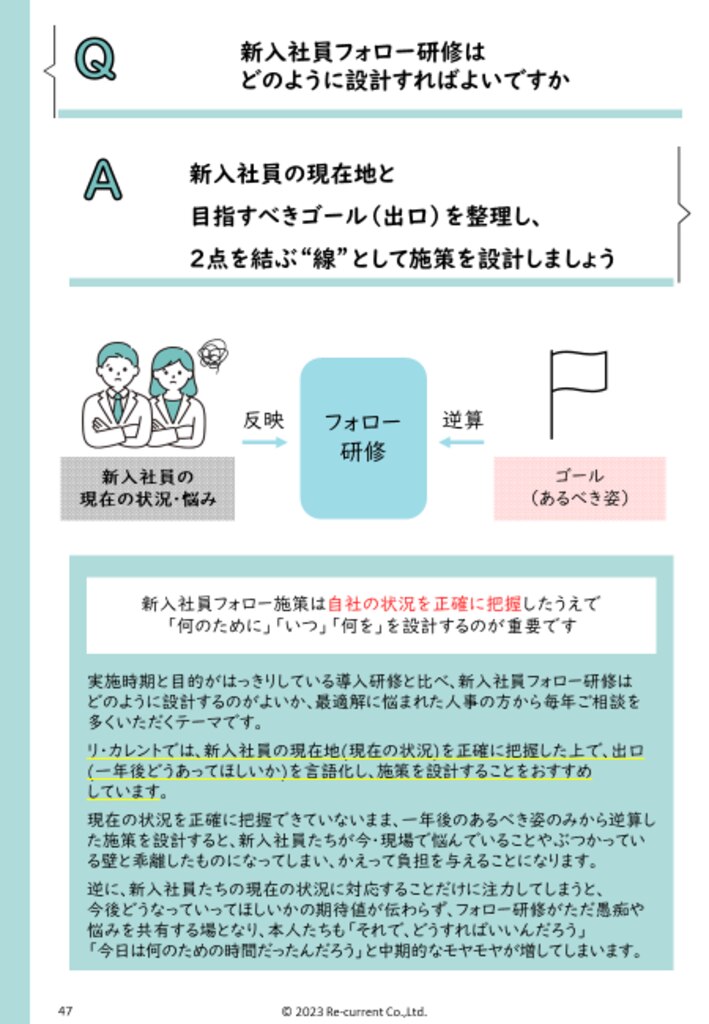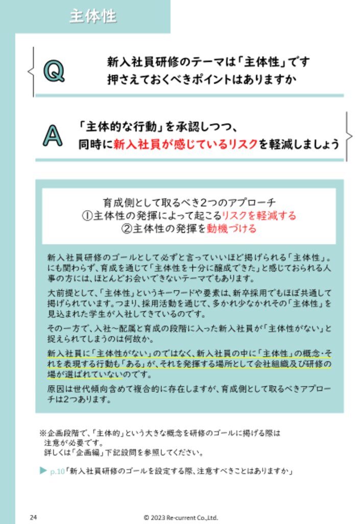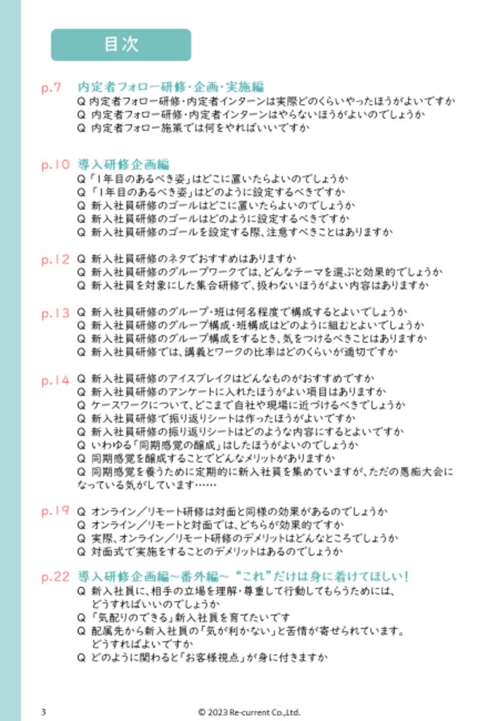 「新人研修百問百答」は、リ・カレント社がのべ382社の人材・組織開発のご支援を通じ蓄積してきた、新人研修の企画・実施・運営・フォローすべての工程についてのナレッジを集約したガイドブックです。