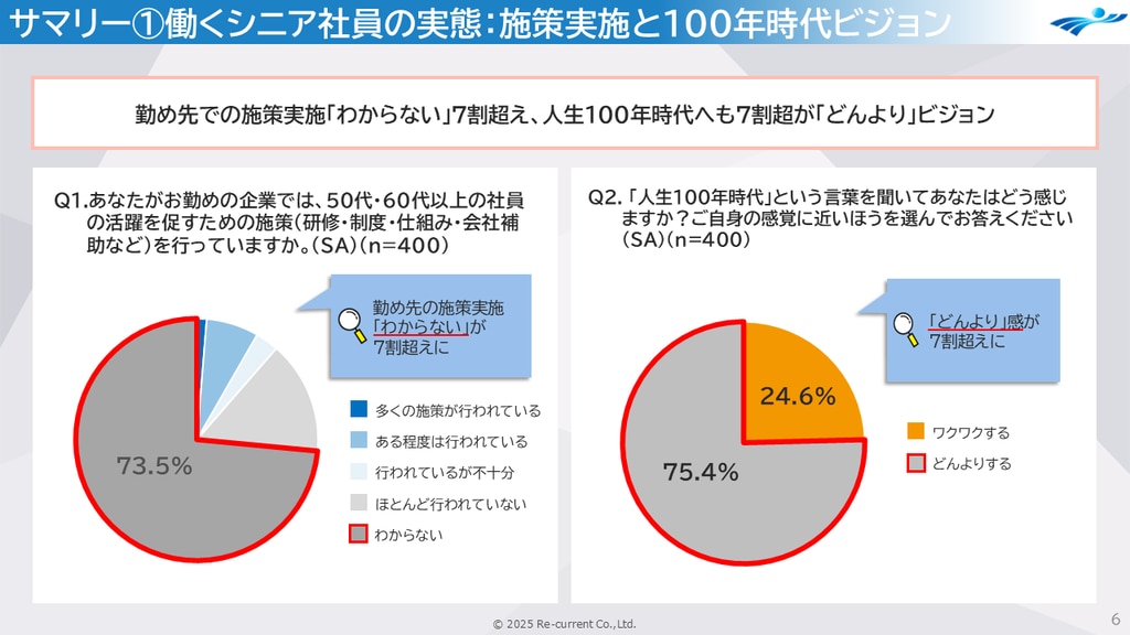 組織・人材開発支援事業を手掛けるリ・カレント株式会社は2025年9月、東京都の働く50代~70代就業者400人を対象に、「人生100年時代」への感じ方、会社からの支援の有無・働くことへの価値観など、シニア活躍の実状と本音に関する調査を行いました。